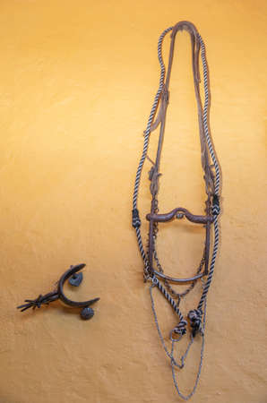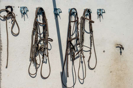 Horse bridles. Set of leather horse Bridles and bits hanging on wall of a stable