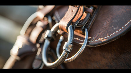 A detailed view of a horses bridle and reins, showcasing the intricate leather craftsmanship and metal buckles. The reins are neatly looped around the bit, ready for the rider to guide the horse.