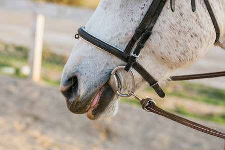 The nose of horse in halter in the paddock. Horse muzzle close up. Sporty stallions gray color in a halter in the levada.