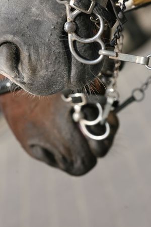 Black-and-white close-up image of the nose of the horse, wearing a bridle and snaffle. Equestrian sport. Nostrils