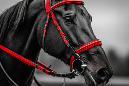 A black and white photo of a horse with a bridle on its muzzle. Equestrian sports and horse riding. Equestrian life.