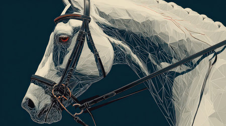 This striking artwork showcases a low-poly geometric design of a horse's head. The abstract representation highlights the beauty and elegance of equine features against a dark background.
