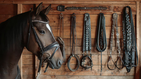A stunning portrait of a horse next to an organized display of leather tack in a rustic wooden stable, showcasing equestrian lifestyle and beauty.