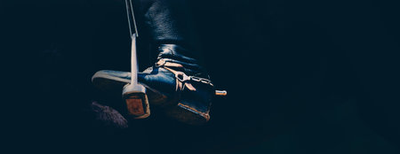 The leg of a rider sitting on a horse in the saddle, in a leather boot and stirrups. Equestrian sports and athletic shoes.