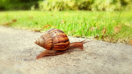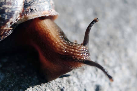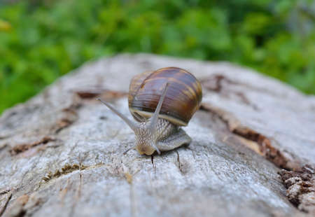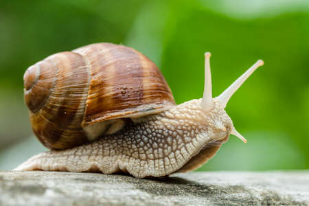 One snail on the natural background, macro view. Big beautiful helix with spiral shell.