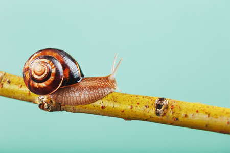 The snail with a house on a shell on its back on green nature background. Easy housing metaphor. Real estate business concept.