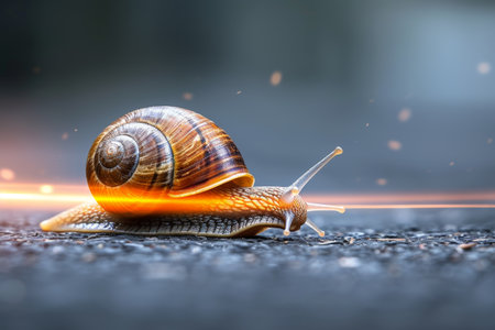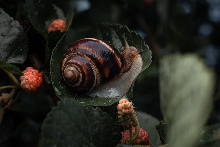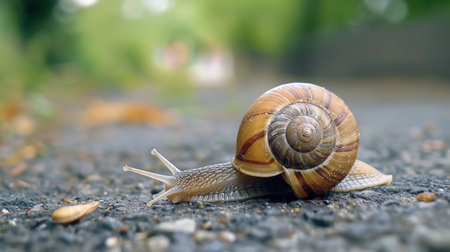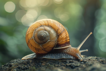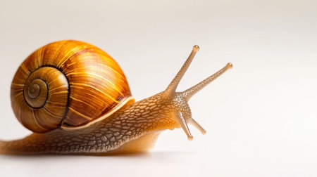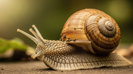 A detailed image of a snail with a patterned shell crawls in a natural setting. The shell exhibits spiral patterns, and the body has a textured surface. The scene is bathed in soft, natural light, and the composition focuses on the subject. Suitable for editorial and commercial use, the image is well-suited for diverse applications.