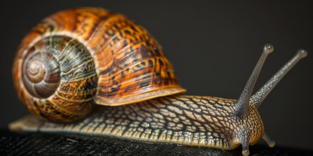 Closeup image of a snail showing its shell and antennae against a dark background, highlighting natures beauty