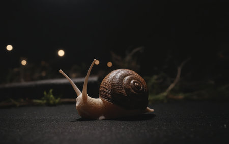 A lone snail embarks on a journey across a dark surface towards distant lights, a metaphor for determination.