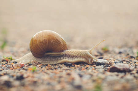 Snail crawling on the ground in the forest at sunset. Helix pomatia.