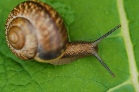 Snail crawling on a green leaf in the garden. Shallow depth of field.