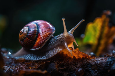 A close up of snail with shiny shell, showcasing its delicate features and texture