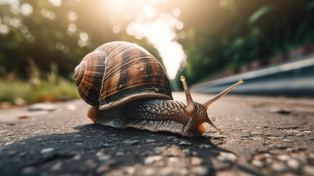 Big snail in shell crawling on road, summer day in garden, generative ai
