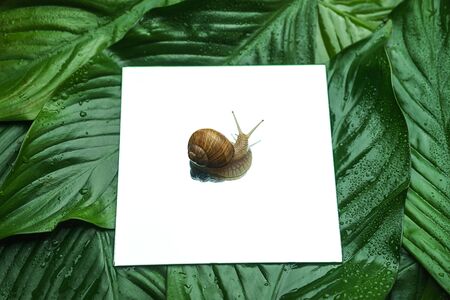 Snail with reflection on mirror and green leaves with rain drops background. Snail slime. Flat lay, top view, copy space. Beauty concept. Minimal natural layout.