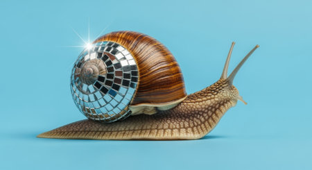 A unique image of a snail with a disco ball shell, set against a vibrant blue backdrop.