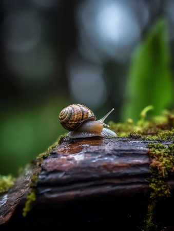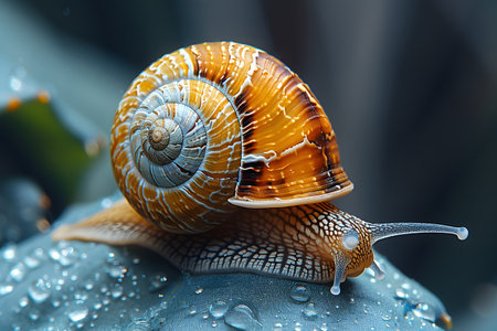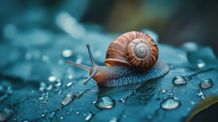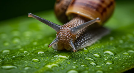 A close-up of a snail slowly crawling on a wet leaf after the rain, with its spiral shell glistening and its tiny antennae extended, capturing the calm of nature.