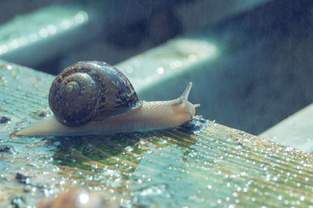 a brown and yellow striped snail upside down, crawling on a wooden bench, after a big rain, in the afternoon