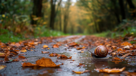 A solitary snail traverses a rain-soaked path surrounded by vibrant autumn leaves. This serene forest scene captures the beauty of nature's transition.