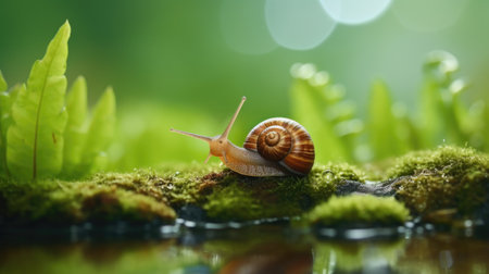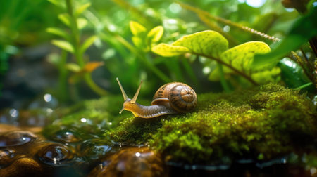 photo of a snail, macro photography , stream of fresh water, young green plant, outdoor springtime. beautiful Generative AI AIG32