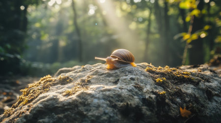 A snail framed by sunlight beams as it crawls on a rock in the wilderness.