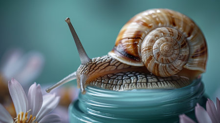 organic beauty product concept snail on moisturizing cream jar, illustrating natural ingredients ideal for copy space