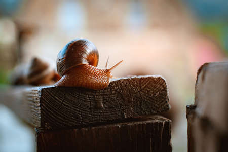 A big snail is crawling on the wet wooden road after the rain. copyspace. natural background. Calmness concept. low speed. Invertebrate animal. rainy weather. One mollusk. Vine gastropod. side view.