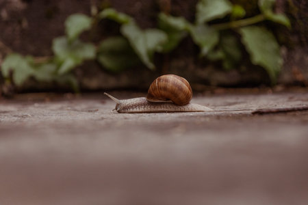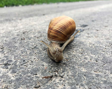 Snail crawling on the road with blurred background. Shallow depth of field.