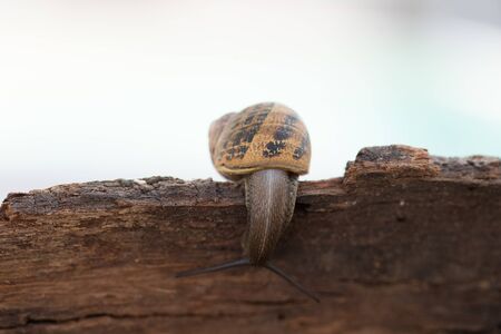snail, Cepaea nemoralis, on a wooden surface Selective focus point, close up