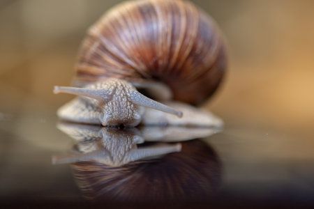 A snail is seen gliding on a wet surface leaving behind a trail of moisture. The creatures spiral shell showcases intricate patterns as it navigates its surroundings