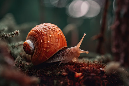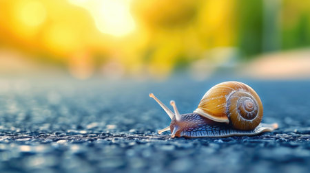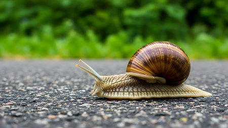 A detailed image of a snail with a patterned shell crawls in a natural setting. The shell exhibits spiral patterns, and the body has a textured surface. The scene is bathed in soft, natural light, and the composition focuses on the subject. Suitable for editorial and commercial use, the image is well-suited for diverse applications.
