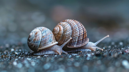 The image shows two snails crawling on a rough, grey surface. The snails are facing the same direction, with one slightly ahead of the other. The snails are brown and tan with dark stripes, and their shells are spiraled and have a shiny, wet appearance. The background is out of focus, but appears to be a blue-grey color.