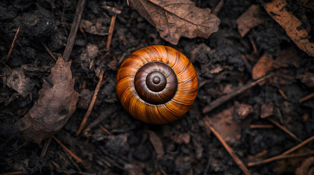 A snail shell viewed from directly above, nestled in dark soil and leaves. The image evokes a sense of earthy tranquility.