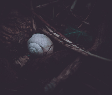 Closeup of a Snail shell in the dirt ,Foliage, Selective Focus, moody theme.