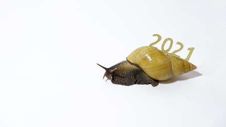 Achatina snail with golden numbers on a shell. New Year 2021 coming concept