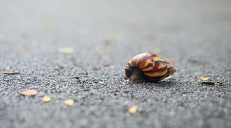 Big garden snail in shell crawling on wet road hurry home, snail Helix consists of edible tasty food coiled shell to protect body, natural animal snail in shell from slime can made nourishing cream