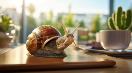 A snail is seen gliding on a wet surface leaving behind a trail of moisture. The creatures spiral shell showcases intricate patterns as it navigates its surroundings
