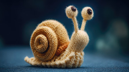 Close-up of a small, handmade snail figurine, crafted from beige yarn, with brown accents and large eyes, resting on a dark surface. The focus is on the intricate details of the knitting and the overall charm of the creature.