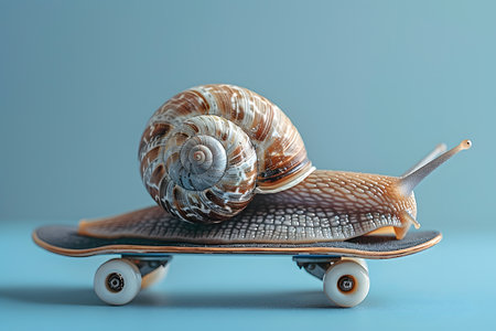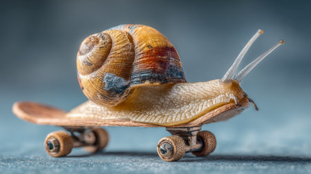 A whimsical macro shot captures a tiny snail poised on a miniature skateboard with wheels, set against a gentle, out-of-focus backdrop, sparking playful imagination about