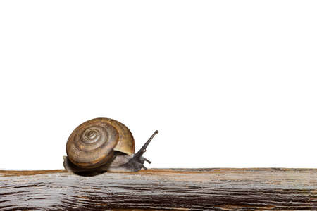 snail, Cepaea nemoralis, on a wooden surface Selective focus point, close up