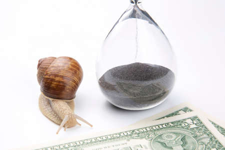 snail next to the hourglass and dollars on a white background. speed and stability in increasing income. time for work and rest. financial business success. time investment target