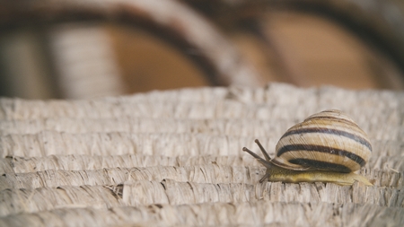 Snail crawling on the road with blurred background. Shallow depth of field.