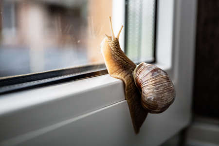 A lonely snail looks out the window and thinks about the past. Rainy weather outside the window. Moving forward and up. Close-up.
