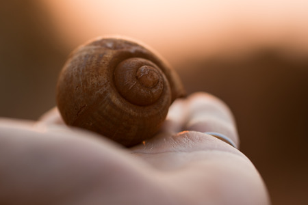 Closeup of beautiful snail walking with hand.