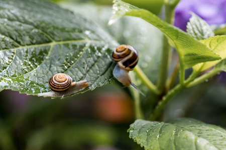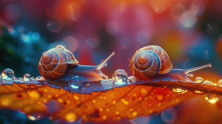 Snails Adorned with Water Droplets: Macro View of Leaf Dwellers.