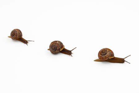 A group of snails on a white background, crawling in one line, side view.