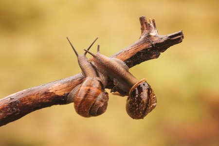 Land snail on a tree trunk, close up view. Mediterranean white garden snails moving slowly approaching each other, blur green nature background.