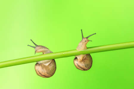 Snails crawl on a green wet surface. Dance of the snails.