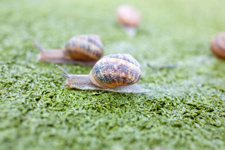 snails coming out from the green grass in rainy weather concept