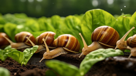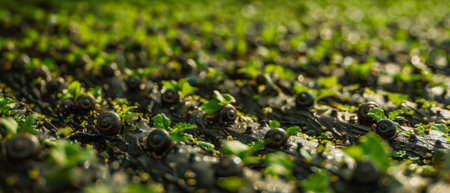 A close-up view of snails amidst young sprouts and dew on a snail farm at sunrise, reflecting the serenity of sustainable farming