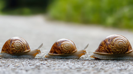 Three snails move slowly along a gravel path surrounded by greenery showcasing their detailed shells and natural habitat.
